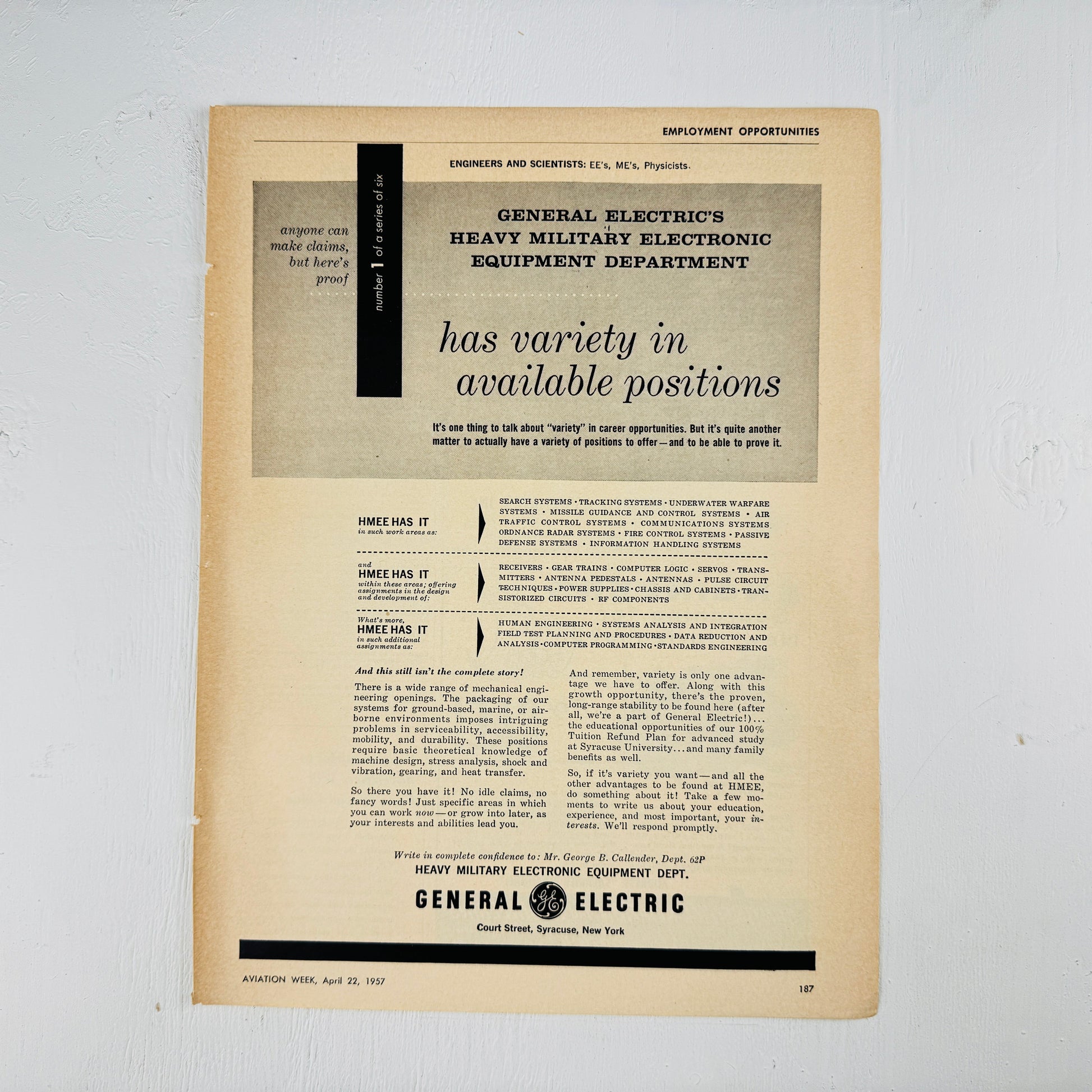This original print advertisement was removed from the April 22, 1957 issue of Aviation Week.